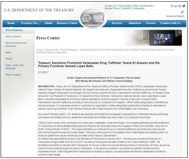 一位不具名的美政府官員13日對媒體透露,艾薩米曾在貝羅的幫助下將重量超過1噸的毒品運往美國和墨西哥。這名官員稱,美財政部13日的決定將凍結價值數千萬美元的資產。