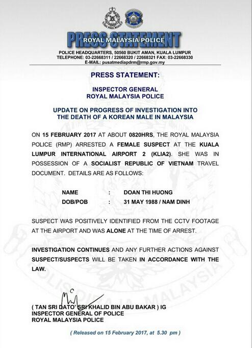 马来西亚警方根据情报及闭路电视片段,在吉隆坡机场拘捕一名持越南护照的28岁女子,马来西亚传媒引述消息指,她能说简单的马来语及英文,接受警方盘问时表现镇定,但否认杀人,指以为是恶作剧,声称循从一名女同伴用喷雾剂喷向金正男,另一名男同伴就用手帕捂住金正男嘴巴。警方认为她口供有疑点,正追缉另外五名持朝鲜及越南护照的同伴。