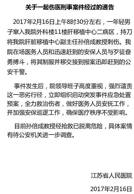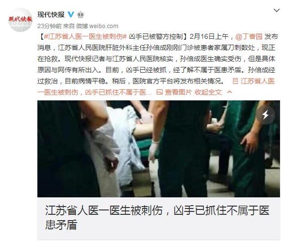 2月16日上午,@丁香園發布消息,江蘇省人民醫院肝臟外科主任孫倍成剛剛門診被患者家屬刀刺數處,現正在搶救。現代快報記者與江蘇省人民醫院核實,孫倍成醫生確實受傷,但是具體原因與網傳有所出入。目前,兇手已經被抓,經了解不屬于醫患矛盾。孫倍成經過救治,目前病情平穩。