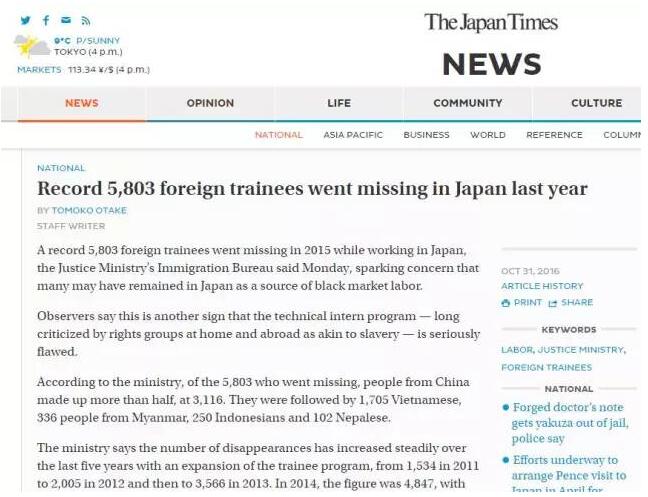 《日本時報》2016年的一篇報道稱,2015年,共有5803名在日研修生失蹤,其中來自中國的為3116人,占到一大半。過去5年,這個數字一直在不斷增加。