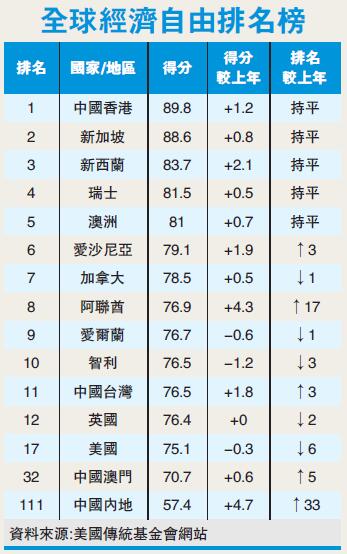【香港商報訊】記者韓濠昕、潘晶報道:當地時間15日,美國智庫「傳統基金會」公布2017年《經濟自由度指數》報告,香港連續23年被評為全球最自由經濟體,反映香港繼續是全球最自由、最有競爭力的金融商業中心;排名第二及第三位分別是新加坡和新西蘭。至於大中華區,臺灣經濟自由度排名上升至第11位,澳門排名32位,內地排名111名較去年勁升33位。昨日,行政長官梁振英及財政司司長陳茂波均高度肯定香港在經濟自由方面的成就。