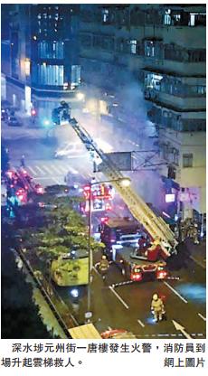 及至昨日淩晨5時27分,深水埗元州街412號一幢唐樓,其2樓一個房單位發生火警,冒出大量濃煙,居民聞濃煙自行疏散,但部分通道被煙火阻擋,逃生無門。消防員接報到場,發現多名居民在窗邊揮手求救,一邊開喉灌救,並動用雲梯救出19名居民,7男21女(年齡由6個月至56歲)吸入濃煙不適須送院。
