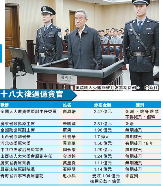 【香港商報網訊】天津市第二中級法院昨天公開宣判中國最高人民法院原副院長奚曉明受賄案,奚曉明被控受賄約1.1億元(人民幣,下同)。法院對其以受賄罪判處無期徒刑,剝奪政治權利終身,并處沒收個人全部財產,對其受賄所得財物及其孳息予以追繳,上繳國庫。奚曉明成了繼黃松有之后,建國以來第二位落馬的最高法副院長、二級大法官。孟建柱曾形容奚曉明案是「司法界的恥辱」。