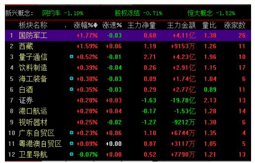 板塊方面,國防軍工、西藏、量子通信、海工裝備、證券、白酒等板塊漲幅靠前,上海國資改革、農機、新股與次新股、煤炭、高送轉、鋼鐵等板塊則跌幅居前。