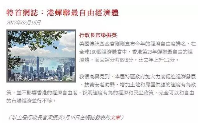美國傳統基金會于美國時間2月15日發表2017年經濟自由度指數報告。香港自該指數在1995年開始編制以來,已連續23年名列榜首。香港今年總分為89.8分(100分為滿分),遠高于全球平均的60.9分。