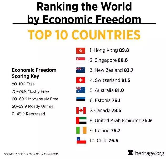 香港,又是香港!香港連續23年獲選全球最自由經濟體!香港時間2月16日稍早,美國智庫“傳統基金會”公布2017全球經濟自由度指數報告,香港再度蟬聯榜首,整體得89.8分,較去年增加1.2分。第二至第五位順序是新加坡、新西蘭、瑞士及澳洲,上述4國排名與去年無變。另外,在全球180個國家和地區中,中國內地及臺灣分別得57.4分及76.5分,分列第111名及第11名。澳門則列第32名。