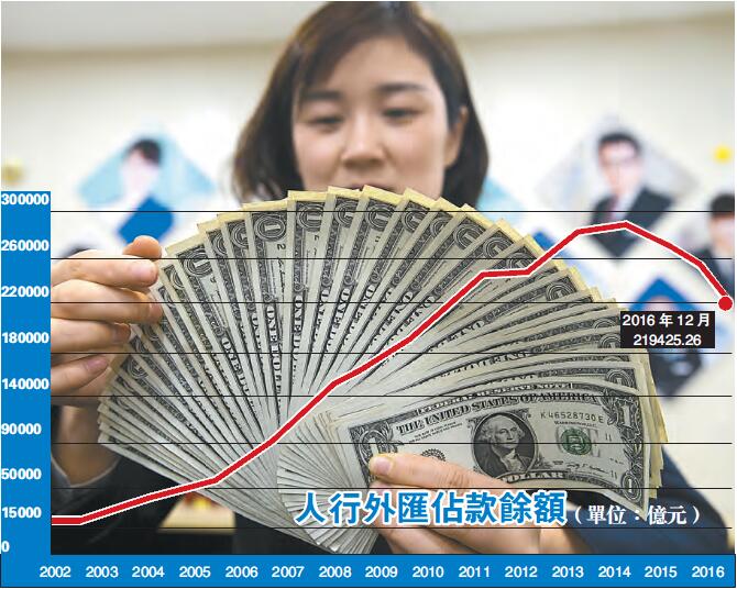 人行此前公布的數據顯示,截至2017年1月末,中國外匯儲備餘額降至29982.04億美元,創2011年2月以來的近六年最低水平,環比下降123.13億美元,降幅為0.41%,為連續7個月下降。分析人士認為,在過去的一兩年,隨著人民幣匯率的持續貶值,中國出現資本不斷外流的情况,人行不得不動用部分外匯儲備維穩人民幣匯率和減緩資本外流的壓力。