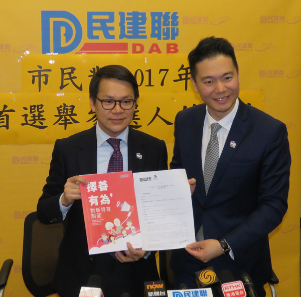 陳克勤(左)及周浩鼎公布民建聯關於特首參選人的民調。 記者 林駿強攝