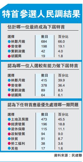 民建聯副主席陳克勤發布調查結果時表示,六成六(66%)受訪者估計林鄭月娥會成為下一屆特首;一成九(19.1%)受訪者認為是曾俊華;4.0%受訪者估計葉劉淑儀出任,1.8%受訪者則估計是胡國興出任。