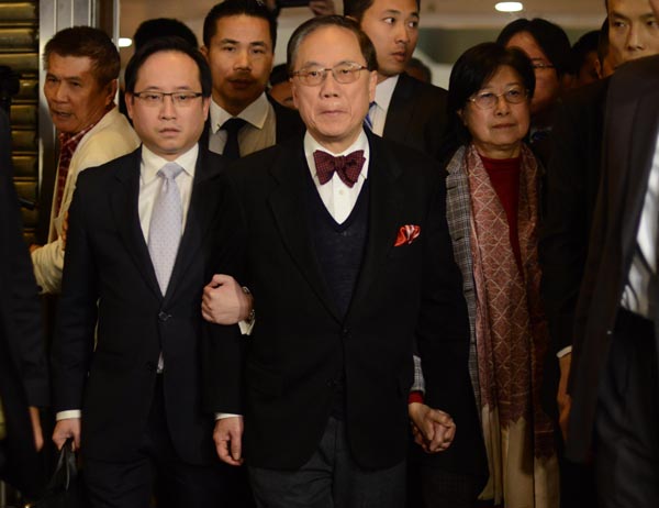 【香港商報網訊】曾蔭權涉貪案經過29天審訊,8女1男陪審團昨日經第2日共19小時退庭商議後有裁決。第一項「行政長官接受利益」罪未能達成裁決,其餘兩項「公職人員行為失當」罪中,一項涉及向行會隱瞞他與雄濤主要股東黃楚標就深圳物業所進行的事務往來及商議,以8比1裁定罪成、另一項涉及何周禮的控罪則以9比0一致裁定不成立。被定罪的曾蔭權,晚上在家人陪同下離開高院時,神情凝重。主審法官陳慶偉批准曾蔭權繼續准以現金10萬元保釋外出,至下周一下午進行求情。據悉,律政司將會正式向法庭申請就該項行政長官接受利益罪名重審。