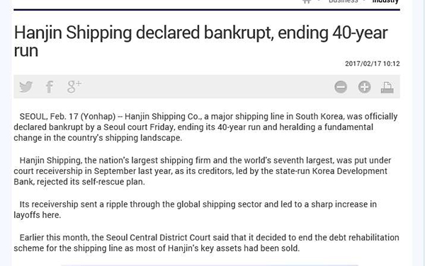 【香港商報網訊】韓國首爾地方法院昨日正式宣布韓進海運破產。由此,曾經是韓國第一大、全球第七大海運企業將消失在歷史長河中。有韓媒指出,韓進海運破產或將在韓國掀起上萬人的失業潮,僅在釜山一地,就將有3000多人失業。而且也將對已陷入政治和經濟困境的韓國社會產生不小冲擊。