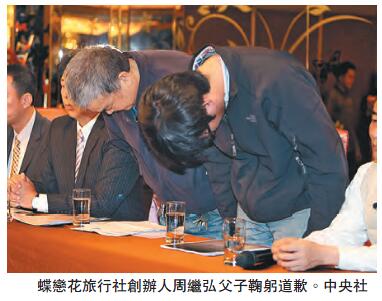 【香港商報網訊】台灣賞櫻團旅游巴失事導致33死意外,承辦這個團的蝶戀花旅行社,創辦人周繼弘父子,昨早首度公開露面道歉。