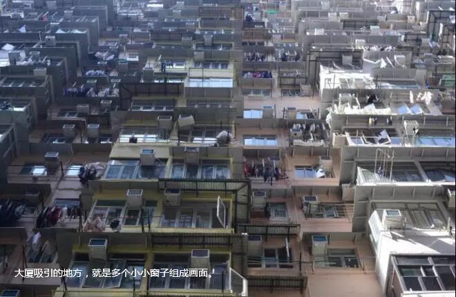 或許是因為從高空俯瞰大樓時,大樓結構像英文字母“E”字,所以被稱為“巨廈”。在“巨廈”中間有兩個“U”型空間,俗稱“光井”,通風及采光極佳,配合當年不是每戶均有能力安裝冷氣機。由“光井”上望,只見密密麻麻的窗口“逼埋一齊”,很有一種壓迫感,令人透不過氣。而從高樓下瞰,人行如蟻過,萬窗像蜂巢。密集的高樓包圍下,居民卻悠然自得,反襯出獨特的風景。夕陽西下時,天空染出一片紅,萬家燈火,裊裊炊煙,又是怪獸大廈另一面好風景。