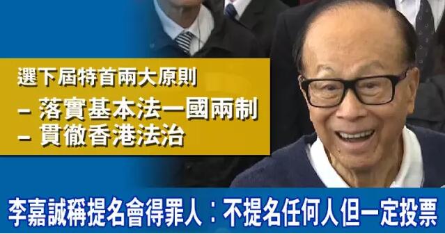 綜合港媒報道,香港首富、長和系主席李嘉誠2月19日出席活動時對傳媒表示:不會在行政長官選舉提名期提名任何一位參選人,惟強調投票期間會參加投票。他強調,下屆特首應該要做到兩大原則:即落實《基本法》與“一國兩制”;貫徹香港法治。