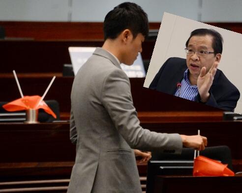 鄭松泰倒轉建制派議員枱上的國旗和區旗。小圖為甘乃威。
