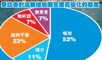 同時,調查發現,市民對預算案「派糖」取態較去年進取,52%受訪者認為相關的總開支應較去年「增加」,而表示「維持不變」者占23%,表示「減少」僅占11%。至於「派糖」措施方面,最多受訪者表示應增加「退稅」的開支(22%),其次是「電費補貼」(17%),再次是「各類額外津貼」及「寬免差餉地租」(各占15%)。受訪者認為應減少的「派糖」措施,依次為「公屋免租」(32%)、「寬免差餉地租」(13%)、「退稅」(12%)及「各類額外津貼」(12%)。
