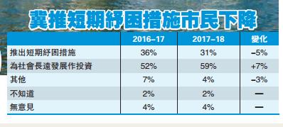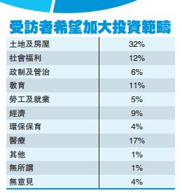 調查結果顯示,與去年相比,高達59%受訪者希望預算案應優先「為社會長遠發展作投資」,增幅高達7%;而認為應優先「推出短期紓困措施」者則占31%,按年下跌5%,反映多數市民期望政府能對社會長遠發展有更多考量與規劃。在「認同長遠投資」的受訪者中,高達32%希望政府推出「土地及房屋」措施,其次為「醫療」(17%),再次是「社會福利」(12%)。