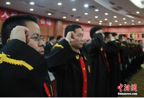 資料圖:西安中級人民法院的31名新任法官宣誓就職。中新社發 張遠 攝