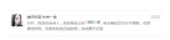 近日,一則《連云港某報知名男編輯多次性騷擾投稿女孩,竟還揚言稱……》的消息在微信里熱傳。消息里一位年輕女孩爆料稱:連云港某報一男性編輯趙某,多次以發稿為由對其進行性騷擾,并且言語挑逗頗為露骨。女孩拒絕其后,趙某竟然還威脅她。