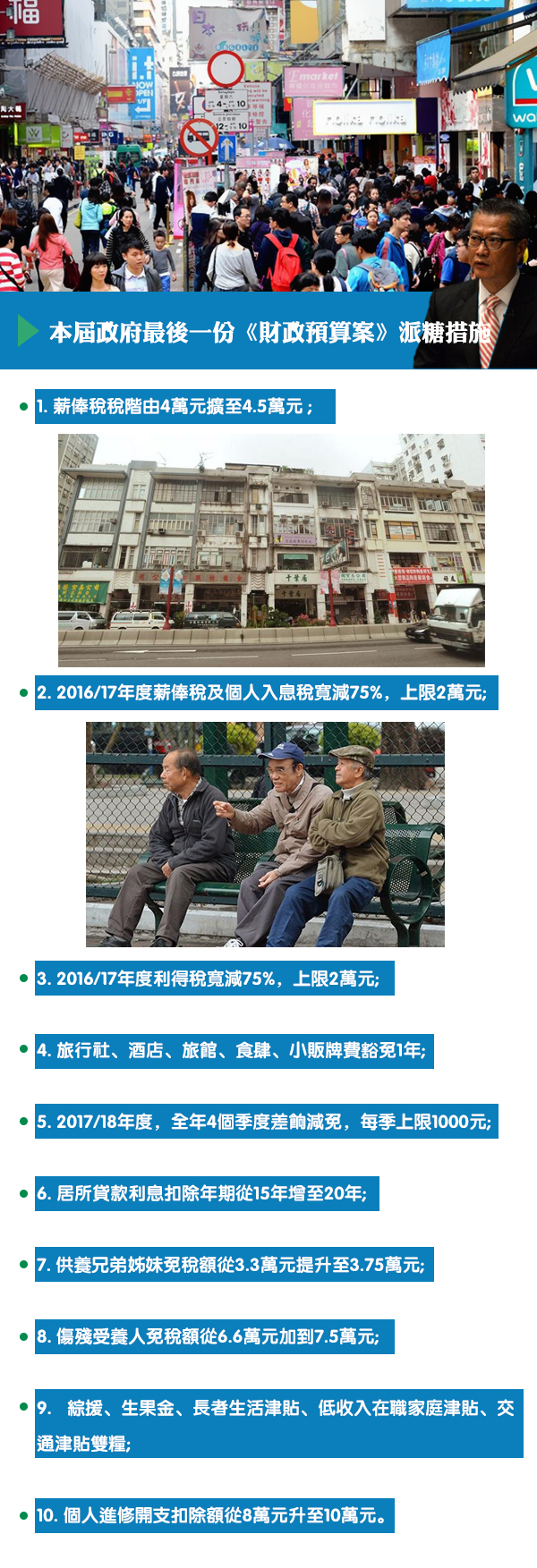 (一)寬減2016/17年度75%的薪俸稅和個人入息課稅,上限為2萬元,全港184萬名納稅人受惠。政府收入將減少164億元。