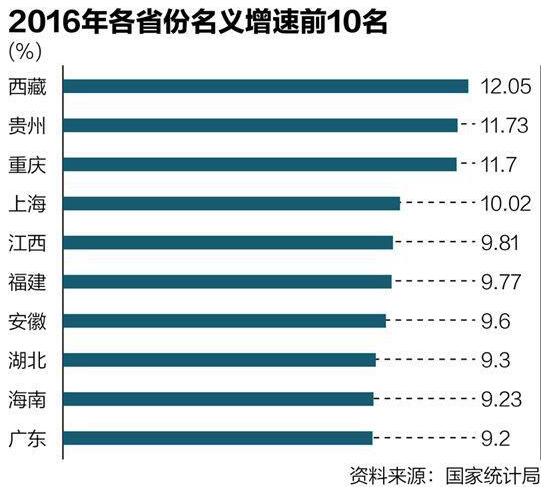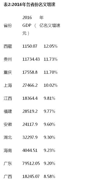 通過對于30個省份(遼寧數據不具同比性,故未納入統計)名義增速的統計發現,2016年,名義增速最高的3個省份為西藏、貴州和重慶,均超過11%,從地理位置上看,它們全部位居中國的西南地區。
