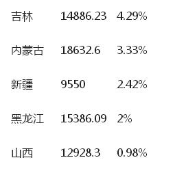 在榜尾,名義增速位居后10位的省份全部位于北方,主要來自東北、華北、西北地區,有5個省份的名義增速低于5%,分別是山西、黑龍江、新疆、內蒙古和吉林。其中山西的名義增速僅為0.98%,黑龍江的名義增速也僅為2%。