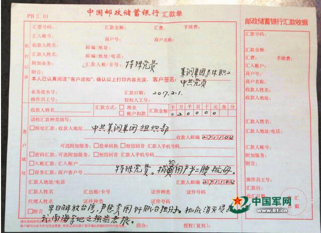 2月6日,山東省鋼鐵集團有限公司萊鋼黨委組織部接到一張匯款單,金額為兩萬元整,簽名為“中共黨員、萊鋼集團退休職工”,附言:“特殊黨費,捐給國產第二艘航母……”