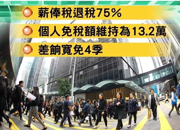 香港新任財政司司長陳茂波2月22日公布本屆特區政府財政預算案。針對當前經濟情況,來年復雜多變的國際政經形勢,并考慮到政府的財政盈余狀況,他指會推出一系列一次性措施措施,包括薪俸稅及個人入息課稅退稅、利得稅退稅75%,上限均提高至2萬元(港元,下同),及寬免2017/18年度的四季差餉,又會增加供養兄弟姊妹免稅額等。