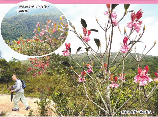 在香港數十條郊遊徑中,西貢鹿湖郊遊徑在這春天時節,擁有獨特的景致,粉嫩嬌紅的吊鐘花正在枝頭盛放,配上遠方高聳的山巒,盡顯花兒的玲瓏優美。這條郊遊徑也難得地可跨過被喻為香港最美麗河溪的雙鹿石澗,大家毋須辛苦攀爬,便能一睹其部分面目。香港商報記者 鄭玉君