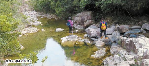 從分叉路走回正確郊遊徑,路徑由石屎小路變成黃土路,大約走半小時,便到最美麗河溪雙鹿石澗的中段最後部分,從這裏可上溯藏於迂迴水道小峽谷的「鳴幽谷」,下攀末段水道陡峭的「藏幽瀑」,最後到終點的「奔槽瀑」。不過要有這些體驗,必須體力過人,並有一定行山經驗,最適當的還是在與郊遊徑相遇的石澗遊賞,想想傳說中的石澗來由,一雙美麗的花鹿在水澗來來回回,開開心心度過每一天。
