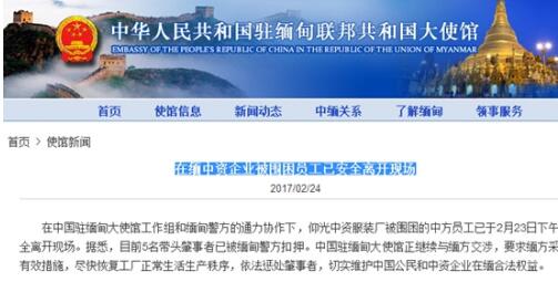 據悉,目前5名帶頭肇事者已被緬甸警方扣押。中國駐緬甸大使館正繼續與緬方交涉,要求緬方采取有效措施,盡快恢復工廠正常生活生產秩序,依法懲處肇事者,切實維護中國公民和中資企業在緬合法權益。
