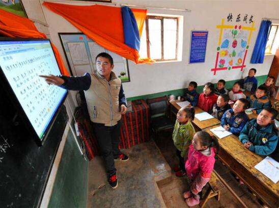 寧夏西海固地區涇源縣涇河源鎮底溝村教學點的老師利用多媒體教學設備給學生們上課。(新華社記者彭昭之2015年3月19日攝)