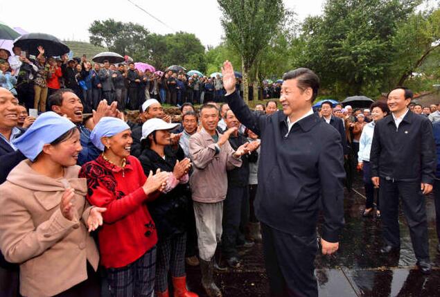 2016年7月18日,習近平在寧夏固原市涇源縣大灣鄉楊嶺村調研考察時向村民們問好。新華社記者李濤攝