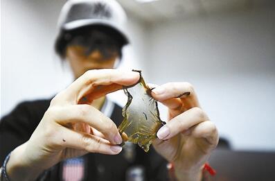 北青報記者將三個品牌的紫菜分別泡入三杯溫水中,大約兩分鐘后,紫菜已完全泡軟。隨后,北青報記者將紫菜從溫水中拿出幾塊展開進行試驗,發現三家品牌的紫菜在泡軟展開后均呈現出透亮的紫黑色,與常見的黑色塑料袋有些許相似。