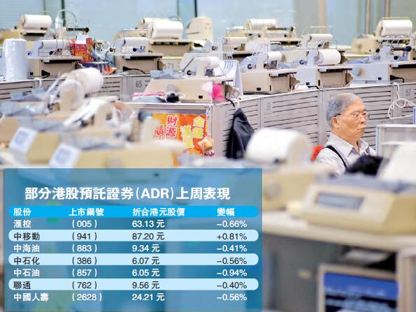 道瓊斯工業平均指數上周五連續11天創紀錄新高,為1992年以來最長升浪,惟ADR上周五表現則普遍向下,當中匯豐控股(005)收報63.13元,較港收市跌0.66%,騰訊控股(700)報210.32元,跌0.42%。若按比例計,相當於恒指跌99點,至23866點。