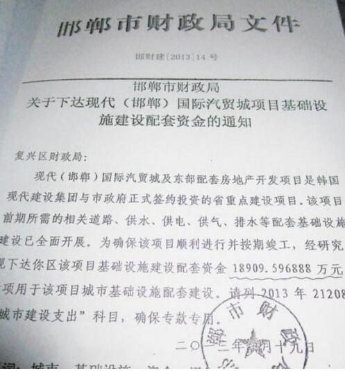 邯鄲市財政局下達現代(邯鄲)國際汽貿城項目配套資金的文件。