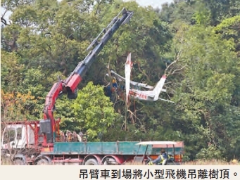 肇事Cessna152型號單引擎定翼飛機,昨仍掛在西沙路園藝高爾夫球場內一棵約3米高樹頂,左機翼撞毀,昨晨11時許,民航處人員到場視察,估計肇事飛機約有一噸重,無漏油跡象,消防高空拯救專隊之後到場協助,準備將飛機移落地面,消防員先切割左邊撞毀的機翼,並用繩索固定,再用吊臂將機翼吊下,惟其餘的機身部分仍擱在樹上,至昨傍晚有關工作仍未完成,今日會繼續進行。