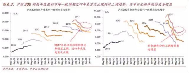 如圖表3所示,中金指出,滬深300指數的2017年凈利潤預測從去年年底至今出現持續回升跡象,尤其是非金融板塊(主要為偏中上游公司)盈利預期回升的更為明顯,香港中資股盈利預期也逐步企穩并有被上調趨勢。