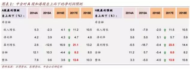 今年A股市場方面,中金預測,綜合來看自上而下預測2017年A股全市場盈利增長從此前的7.9%上調至13.6%: