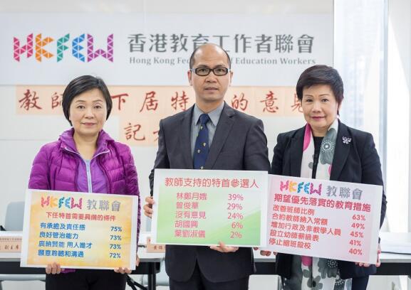 教聯會於今年2月訪問了近700名教師,結果發現近乎所有教師均期望能為師生提供穩定的教育環境(99%),97%教師希望下屆特首將教育放在施政首要位置。對於下屆特首優先落實的教育措施,首5項依次為「改善班師比例」(63%)、「將合約教師納入常額編制」(49%)、「增加行政及非教學人員」(45%)、「設立幼師薪級表」(41%),以及「停止縮班殺校」(40%)。