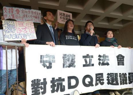 梁國雄則穿著「公民抗命」字樣的T恤、撐著寫有「結束一黨專政」等字句的黃傘、拿著刪去「人大831」的紙板、在行往宣誓時高呼口號,更用不自然地大聲的語調和方式讀出誓詞,在讀出「中華人民共和國」時快速讀完,種種行為加起來看,明顯地有客觀效果:梁有意傳遞政治主張多於誓詞內容,猶如叫人看著他傘上所寫的政治主張。