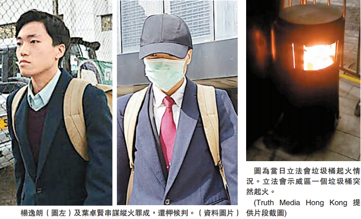 【香港商報網訊】立法會前年年底就版權(修訂)條例進行二讀,因法定人數不足而流會。當晚立法會示威區發生垃圾桶爆炸事件,事後兩名男子被控一項串謀縱火罪。負責「睇水」的首被告葉卓賢早前已認罪;否認控罪的次被告「佔中輔警」、樹仁大學學生會前會長楊逸朗經審訊後,昨日被裁定罪名成立。暫委法官王詩麗將判刑押後至本月22日,期間為葉索取勞教中心報告,但明言不代表會判葉入勞教中心,向他指出仍有機會判監,兩被告均須即時還柙候判。