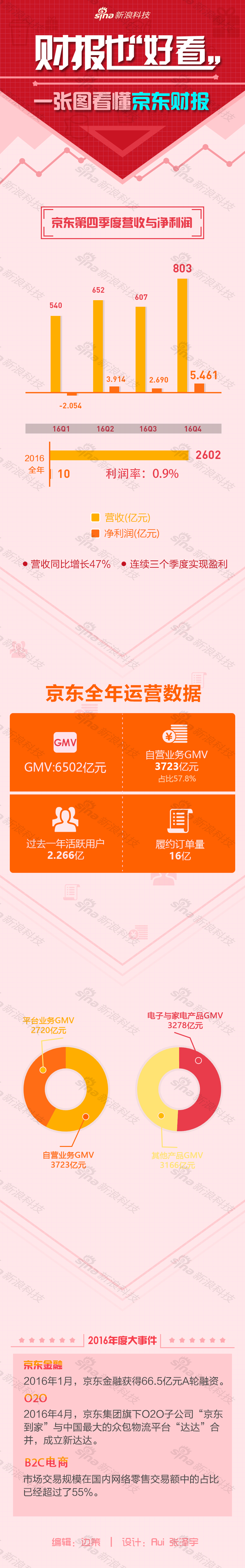 不過,對於京東來說,2016年最大的收獲仍是經曆了19年虧損壓力之後,迎來第一個扭虧為盈的全年財報,根據京東財報,京東2016年營收2602億元,淨利潤為人民幣5.461億元(約合7870萬美元),實現了扭虧為盈,也結束了外界對其連年虧損的質疑。