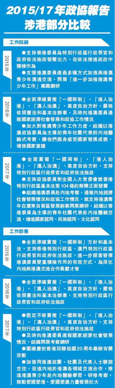 据中通社报道,两会前夕确定了三位特首候选人,香港新届特首选举进入冲刺阶段。关於中央会在两会期间释放属意特首候选人信号说法不绝於耳,惟政协报告2017年重点工作中对此只字未提。相比之下,俞正声再次强调青年工作,表示「要推进港澳青少年赴内地体验学习、研修考察」。