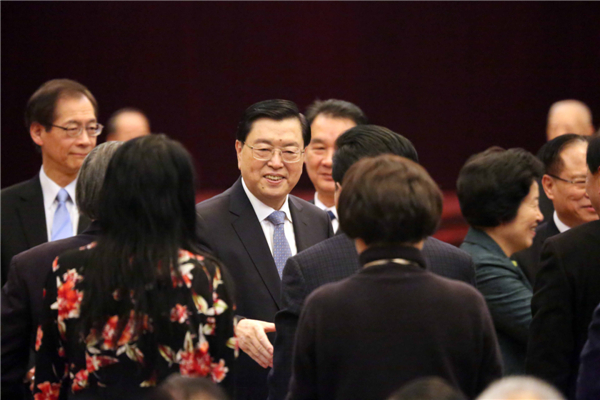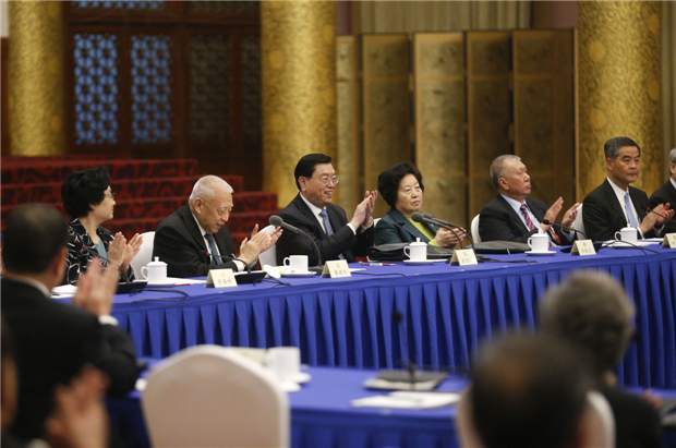 陪同张德江出席会议的,包括统战部部长孙春兰,全国政协副主席董建华、何厚铧、李海峰,国务院港澳办主任王光亚,香港中联办主任张晓明,澳门中联办主任王志民,以及新增补为全国政协委员的行政长官梁振英等。
