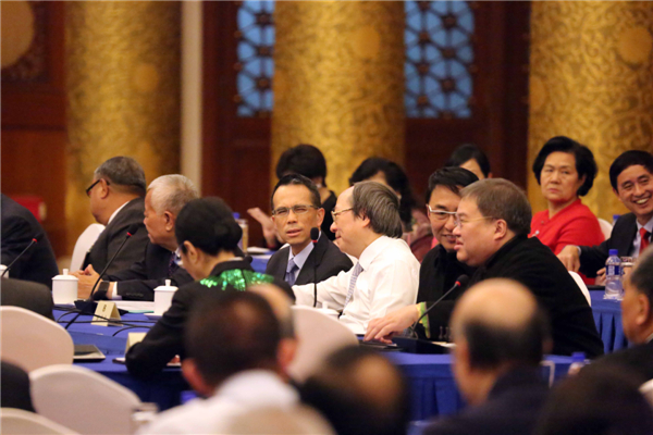政协委员何柱国(中)、汪明荃(左)等在会议上交流。中新社