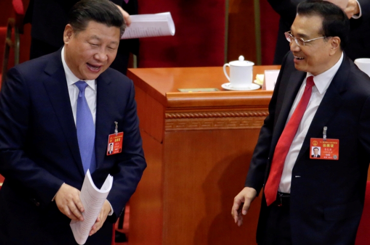 在第十二屆全國人民代表大會第五次會議開幕式上,國家主席習近平與國務院總理李克強互動交流。路透社