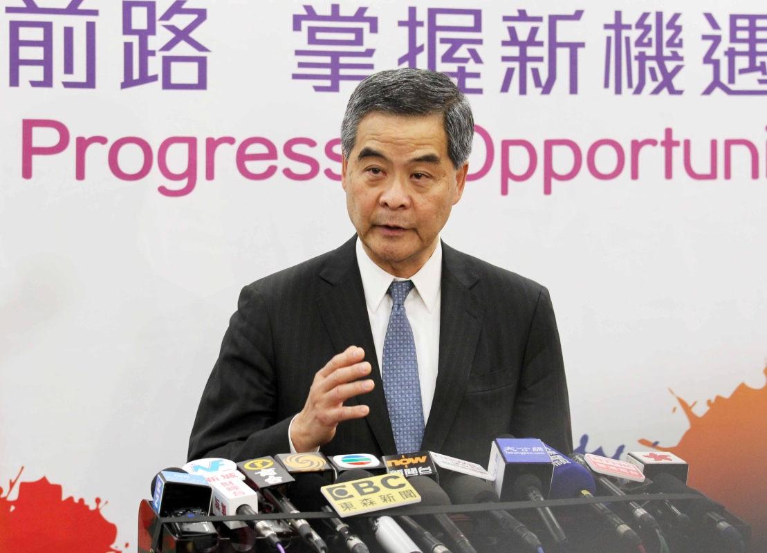 梁振英在北京特區政府駐京辦會見記者,總結北京之行。中通社