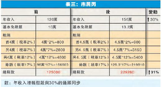 再舉一例,表三之中市民丙此前年收入為120萬元(月入10萬),遠遠超過了當時10萬元基本免稅額110萬元,因此落入了最高稅率的稅階,扣除第一、第二、第三稅階之后,共有98萬元須繳17%的最高稅率,一共涉及稅款17.5萬元。同樣假設他僅與通脹同步加薪30%,至年收入156萬元,在稅階擴闊之后,他當然仍屬最高稅階的一群了,共有129.3萬元須繳17%的最高稅率,總須繳稅約30萬元。換言之,他所負擔的稅款僅較前多約5.4萬元,或31%,基本與通脹一致;以貨幣的實際價值(real value)而非名義價值(nominal value)看,即是根本不用多交稅款!