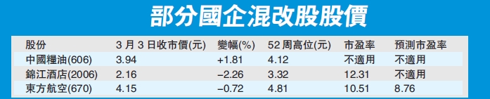 【香港商報網訊】一年一度的兩會已經開幕,會議將對2017年的經濟發展目標、財政與貨幣政策、政策改革如供給側改革、國企改革等作出明確定位。內地當局早前表示,深入推進公司制股份制混合所有制改革(國企混改),混改是國企改革的重要突破口。國企混改概念股走旺,筆者看好航空股龍頭東航(670)、酒店旅遊股錦江酒店(2006)和中糧系的中糧油(606)。香港商報記者譚之穎